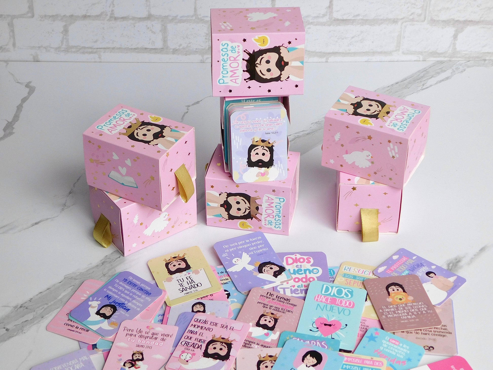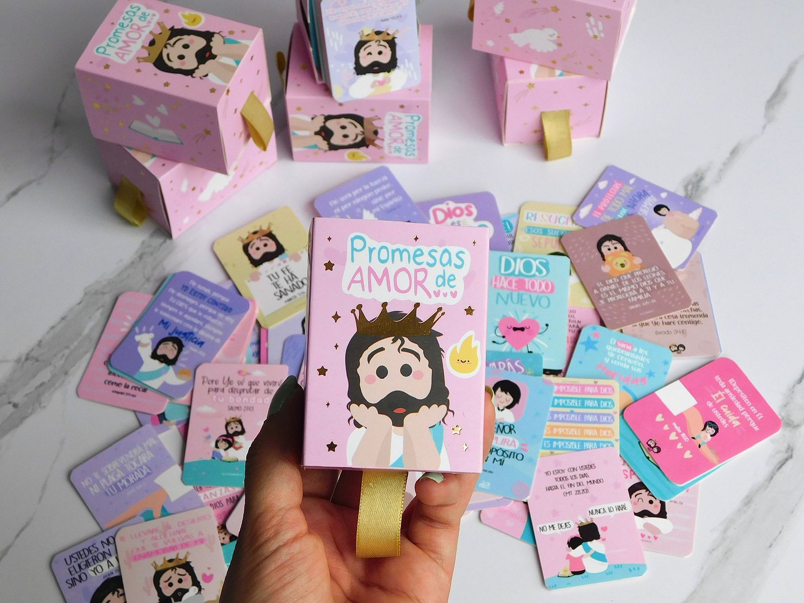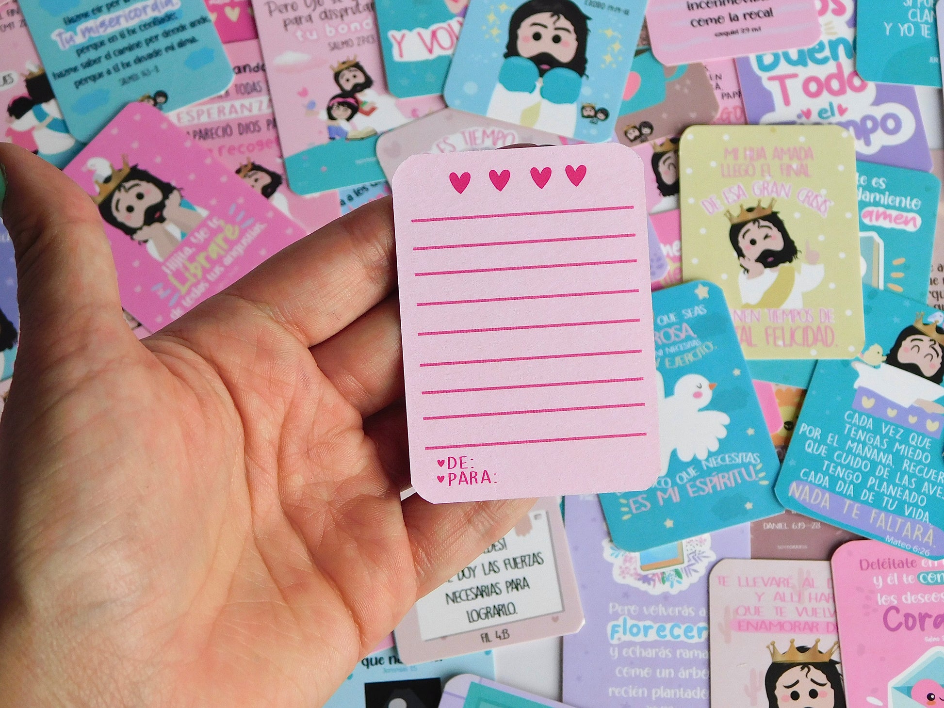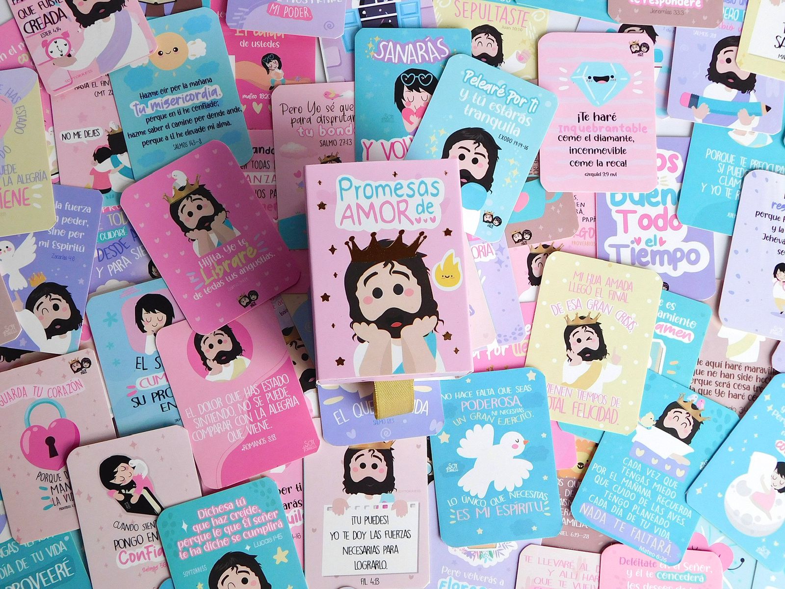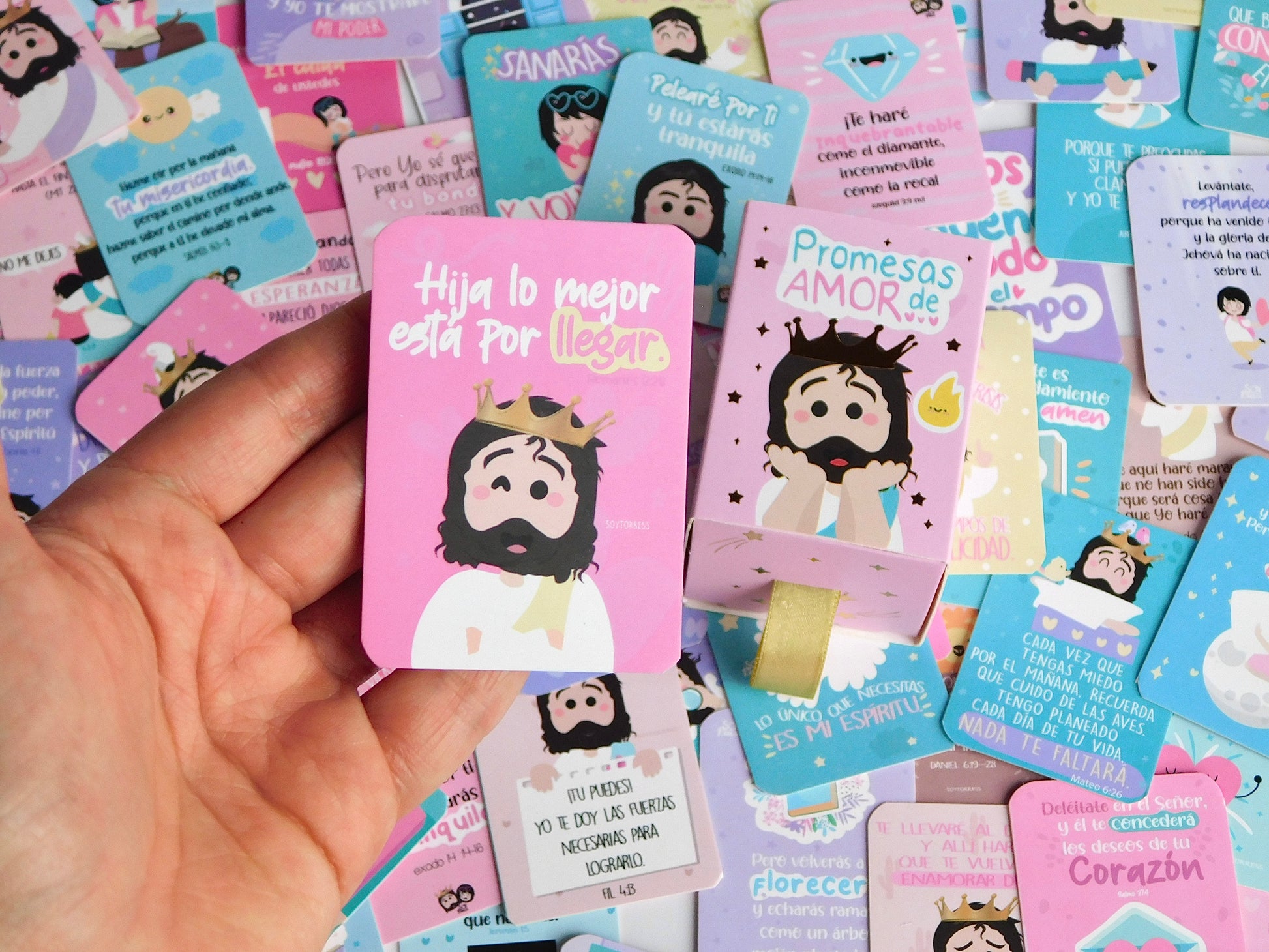 Caja promesas con 100 tarjetas ilustradas y mensajes basados en la Biblia, Diseños modernos y espacio para mensajes personales.