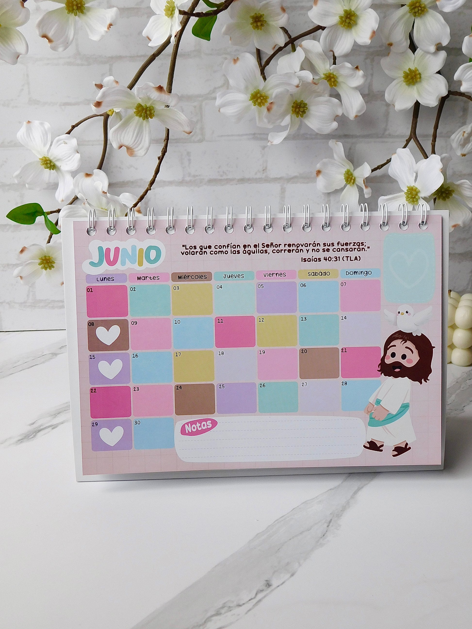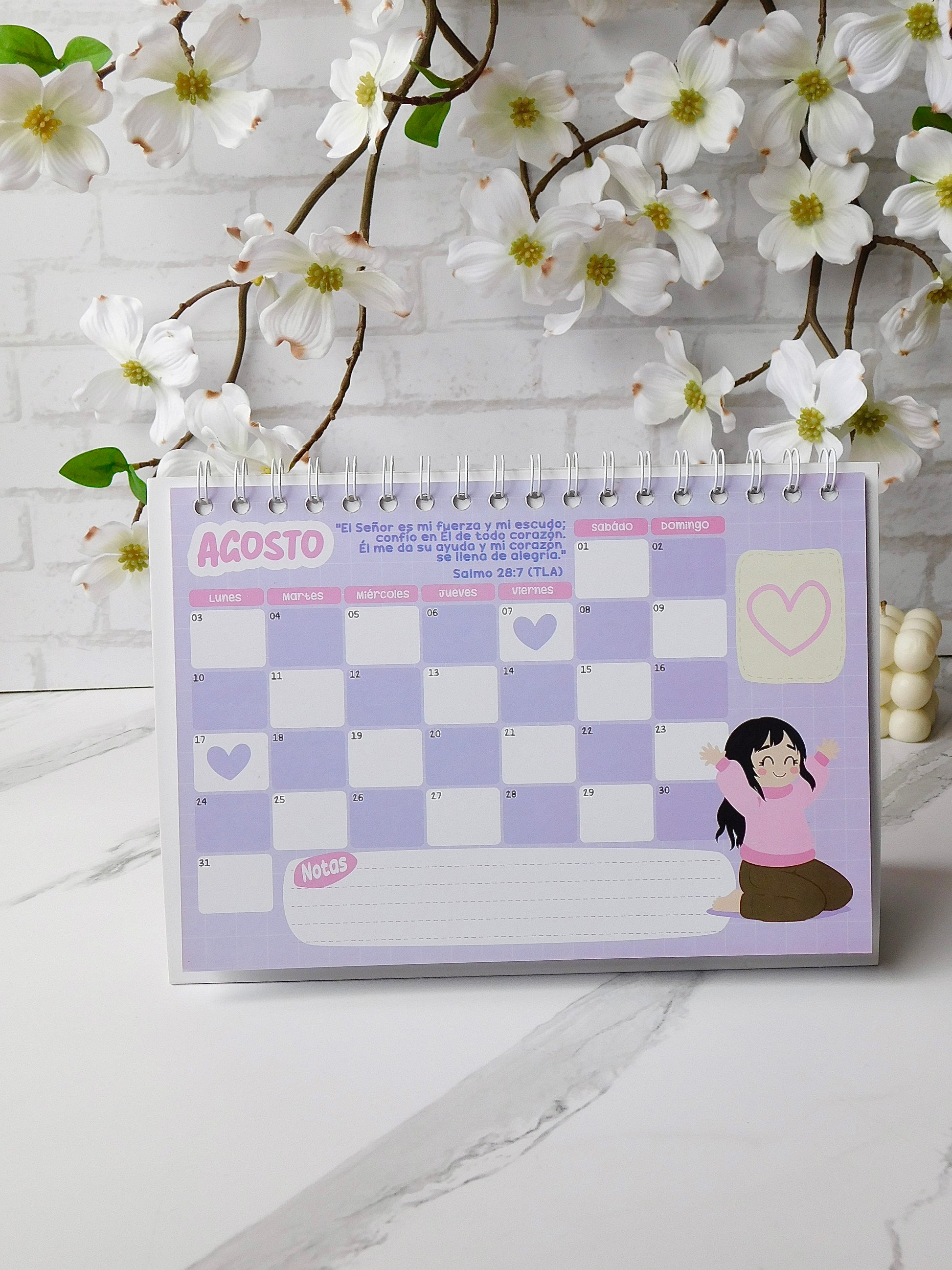 Cada mes incluye un versículo bíblico y espacio para escribir tus metas, agradecimientos o peticiones.